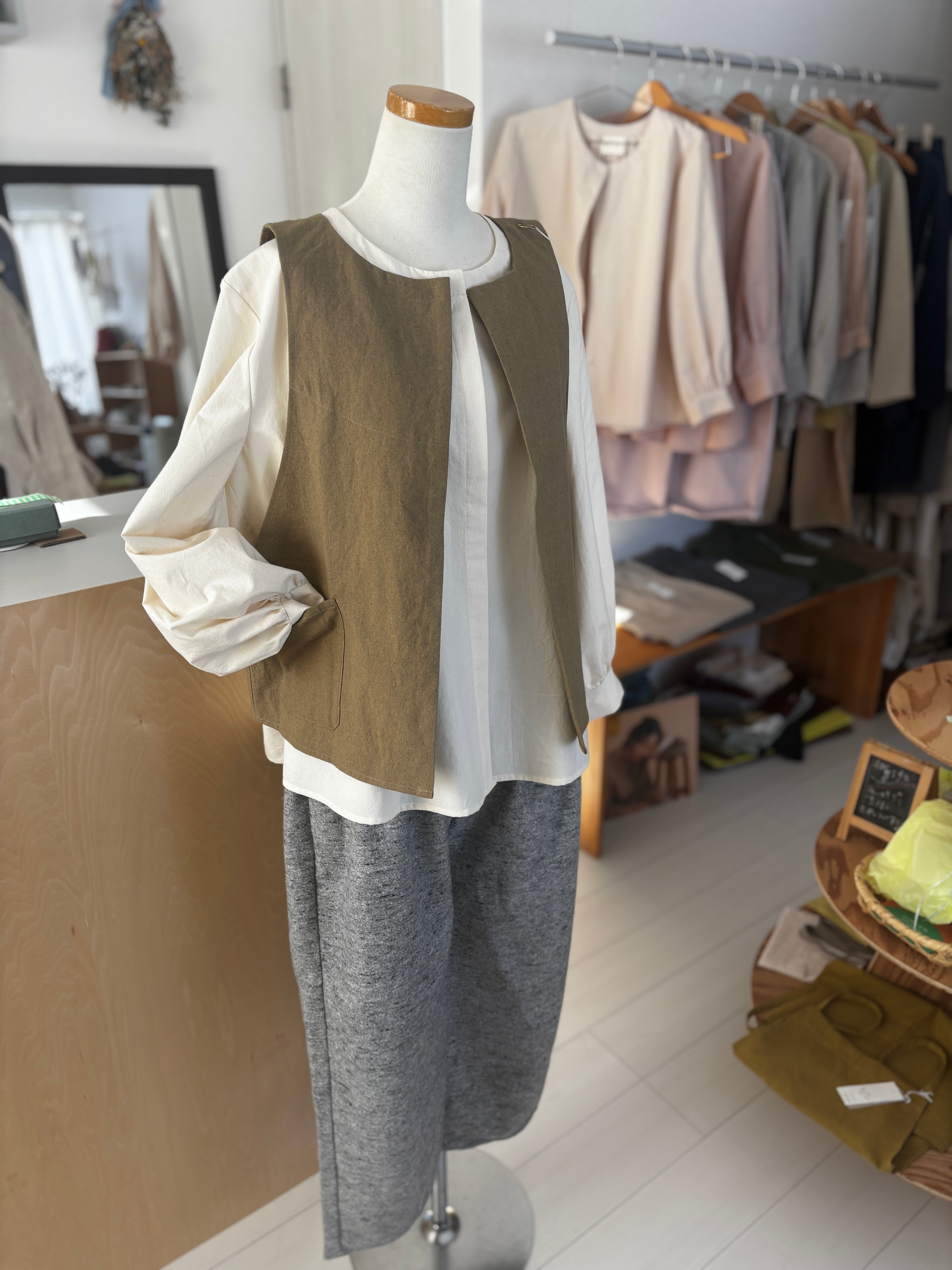 ビンテージ加工のコットンリネン素材で作ったベストです。上品にもカジュアルにも楽しめます。合わせ方でさまざまな楽しみ方を。