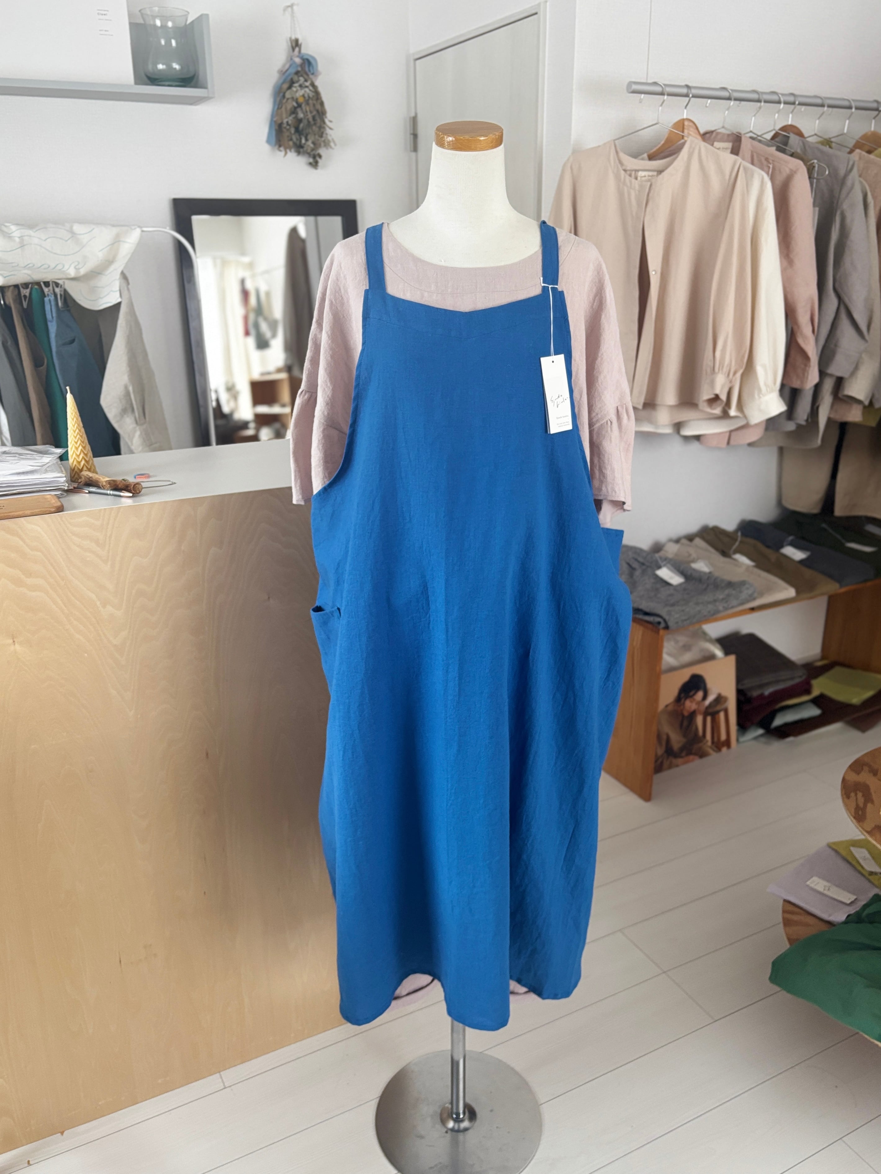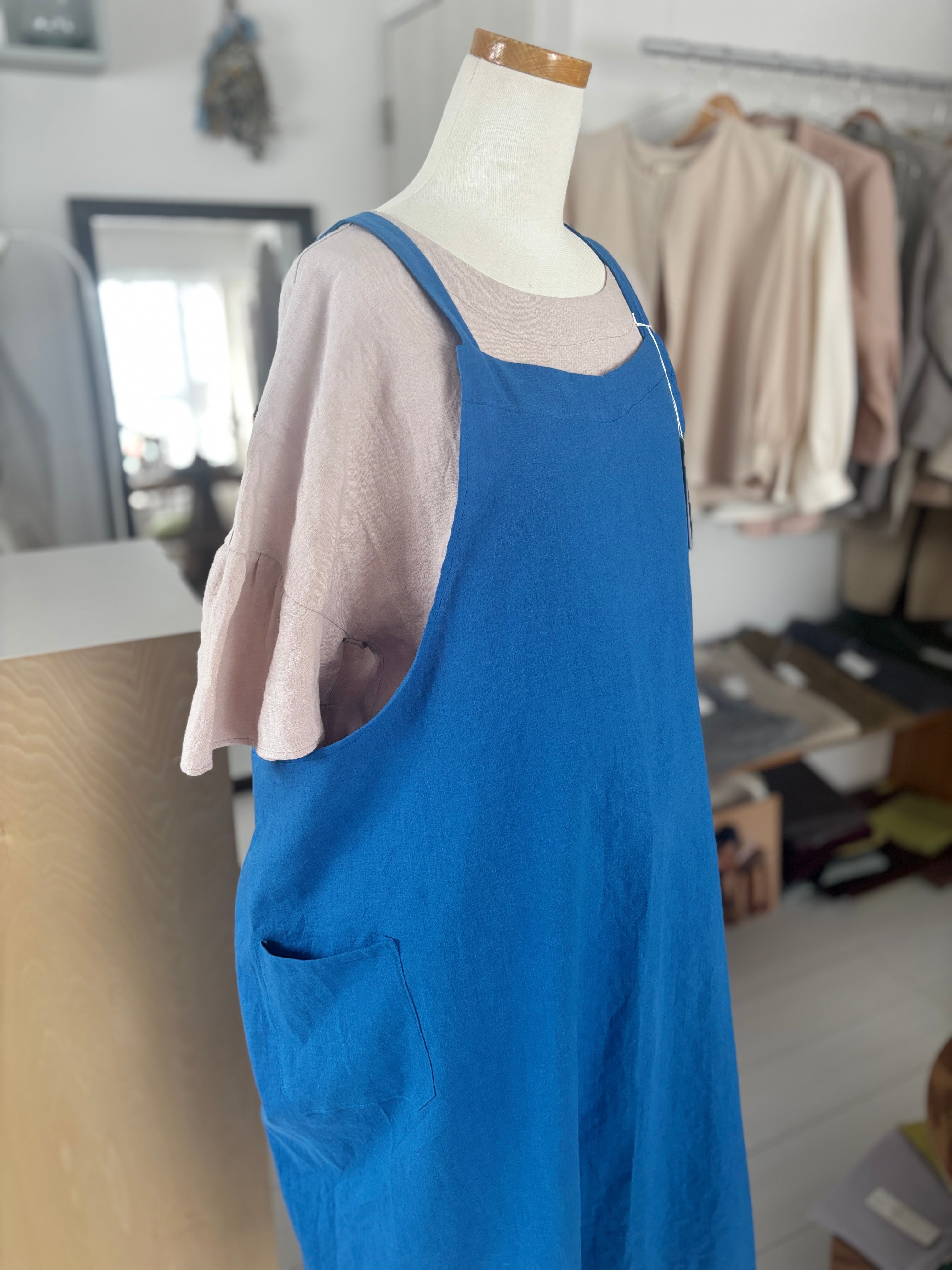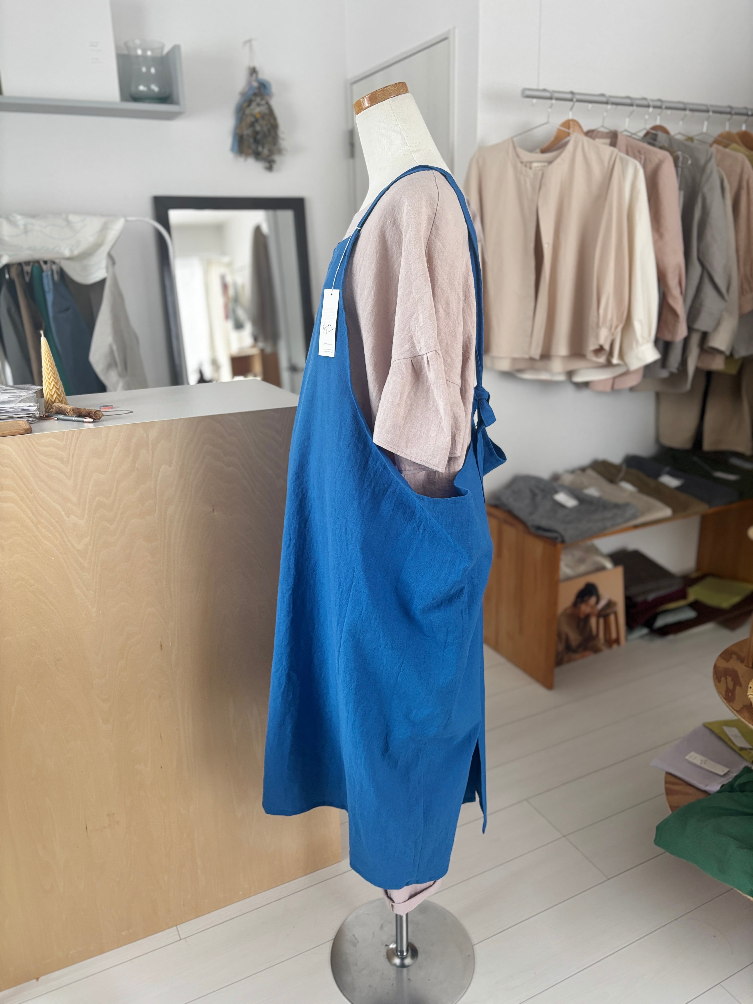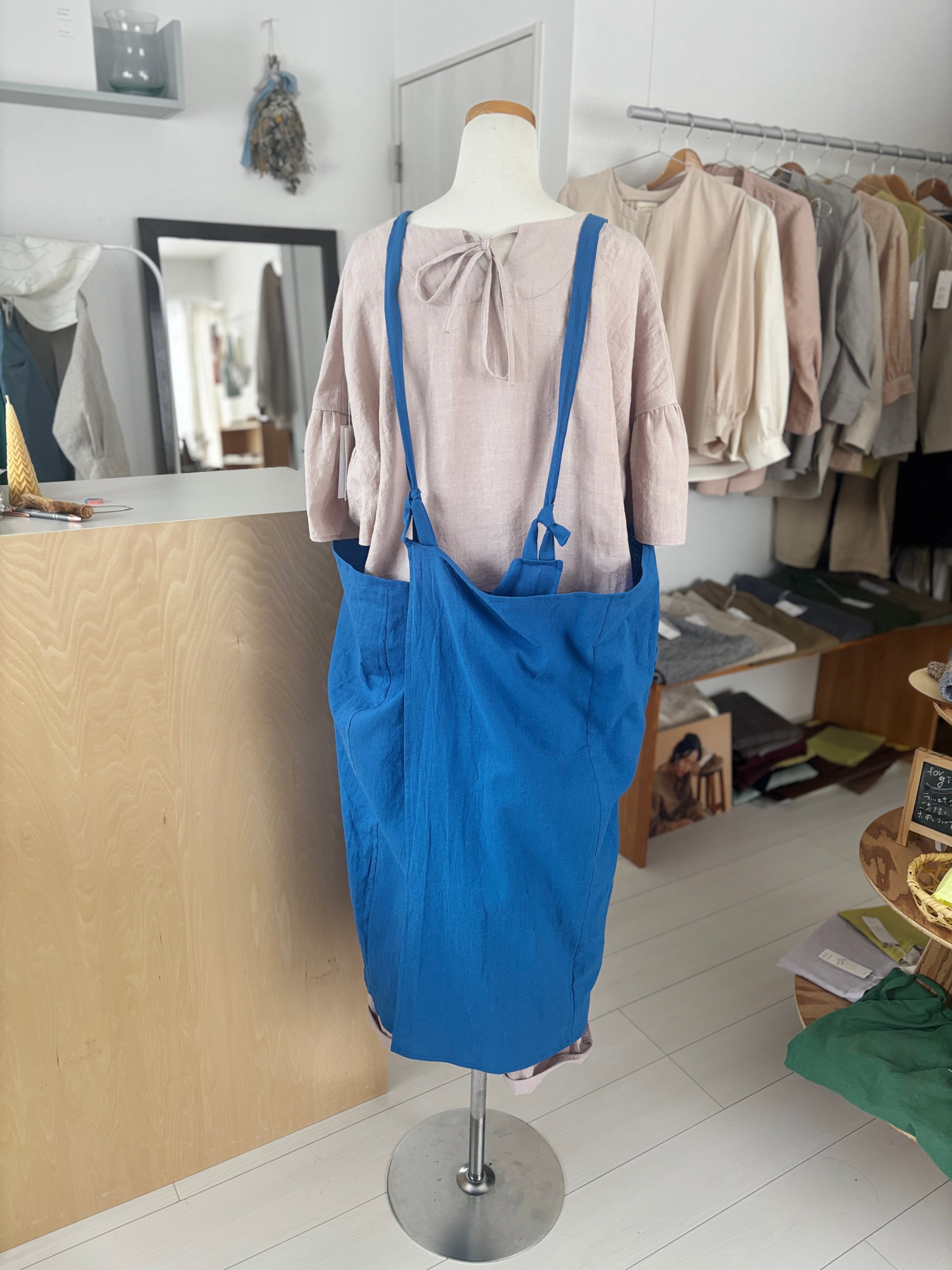軽くてかわいい!人気のコットンリネンのエプロンタイプのワンピース。 後ろも見頃が重なりすっぽりと着れるタイプの形なので今着ているお洋服の上からも楽しめる一枚。エプロンとしての活用もよいですがワンピースとして楽しんでいただける万能なアイテムです。