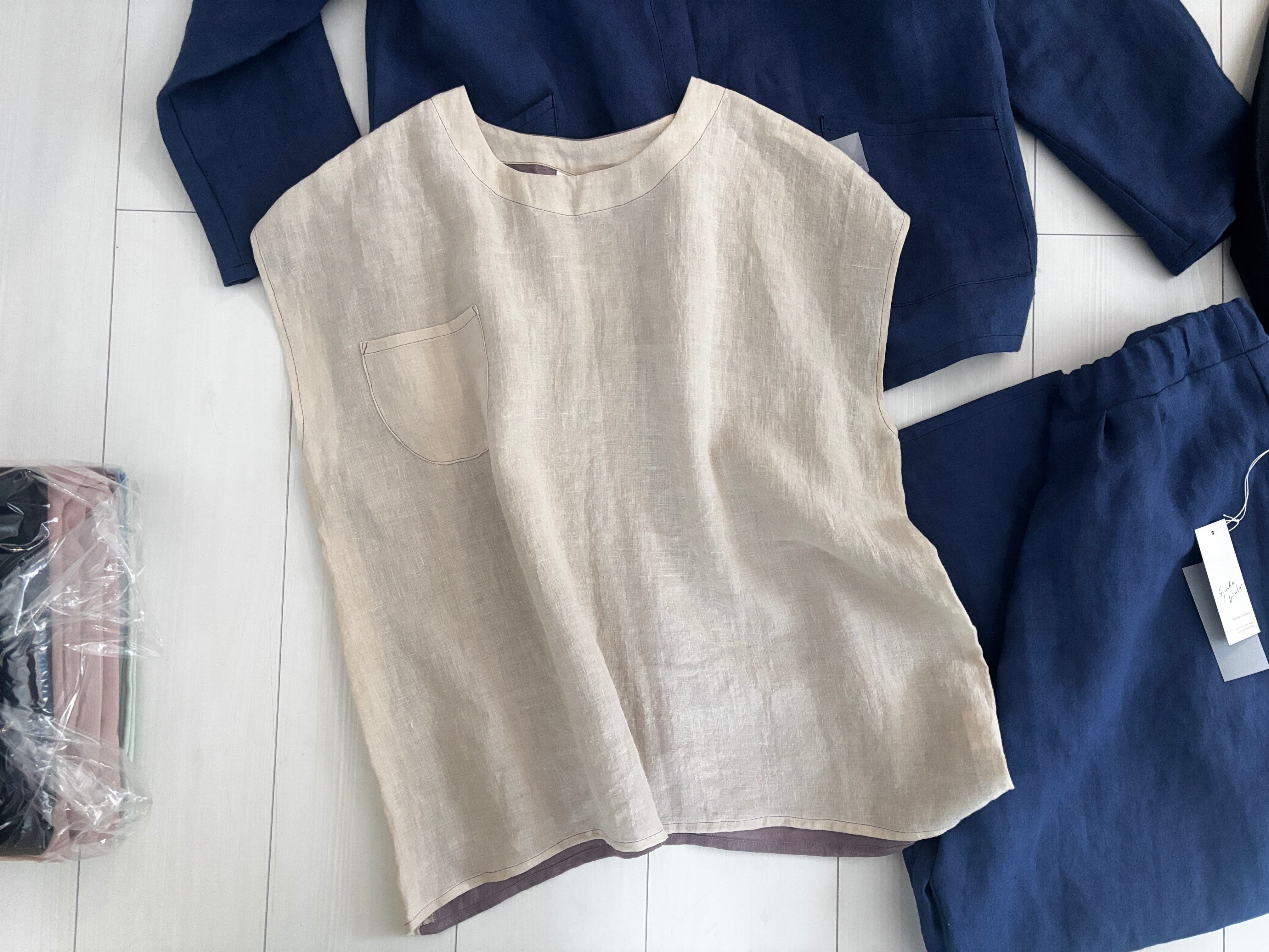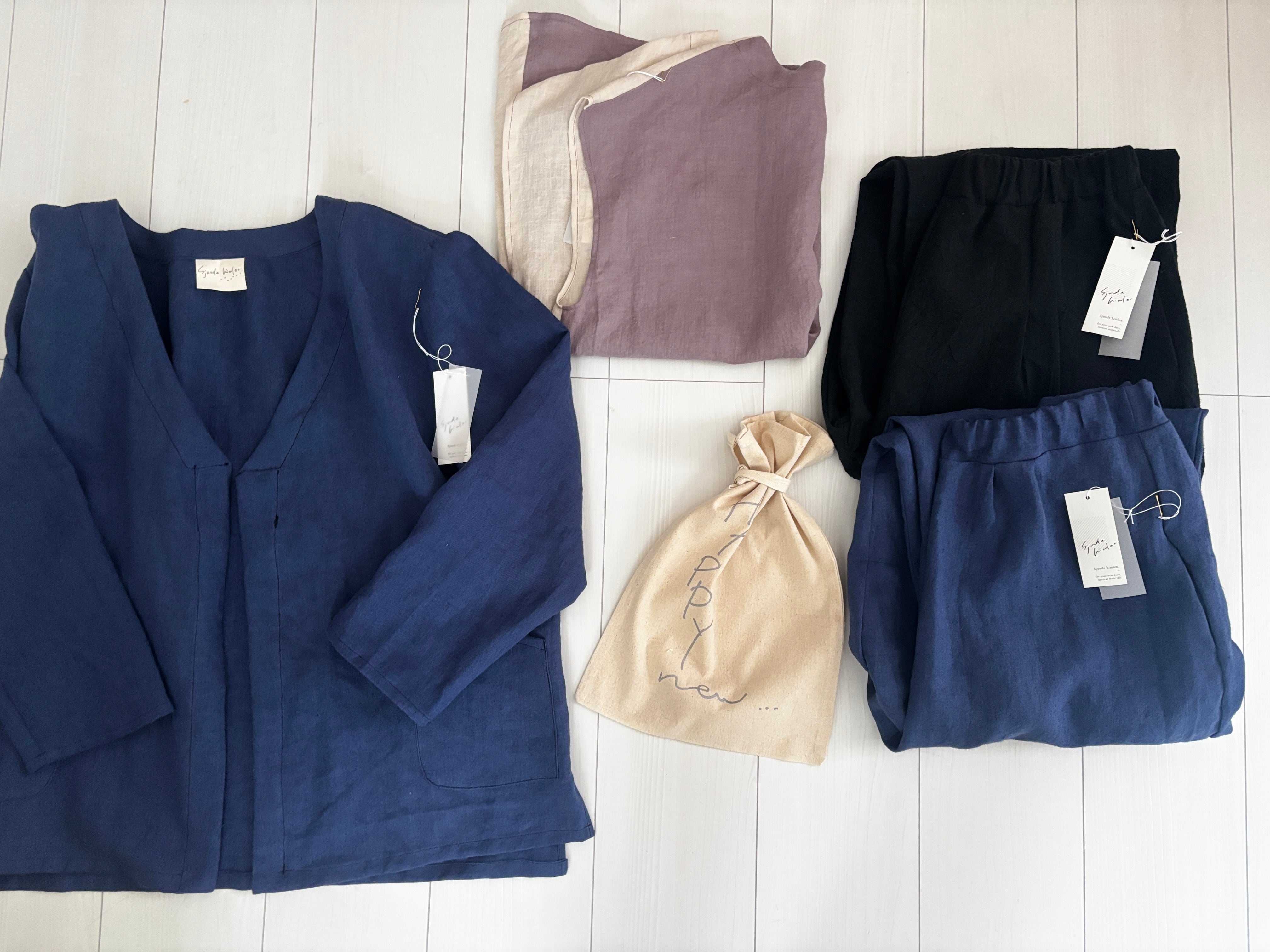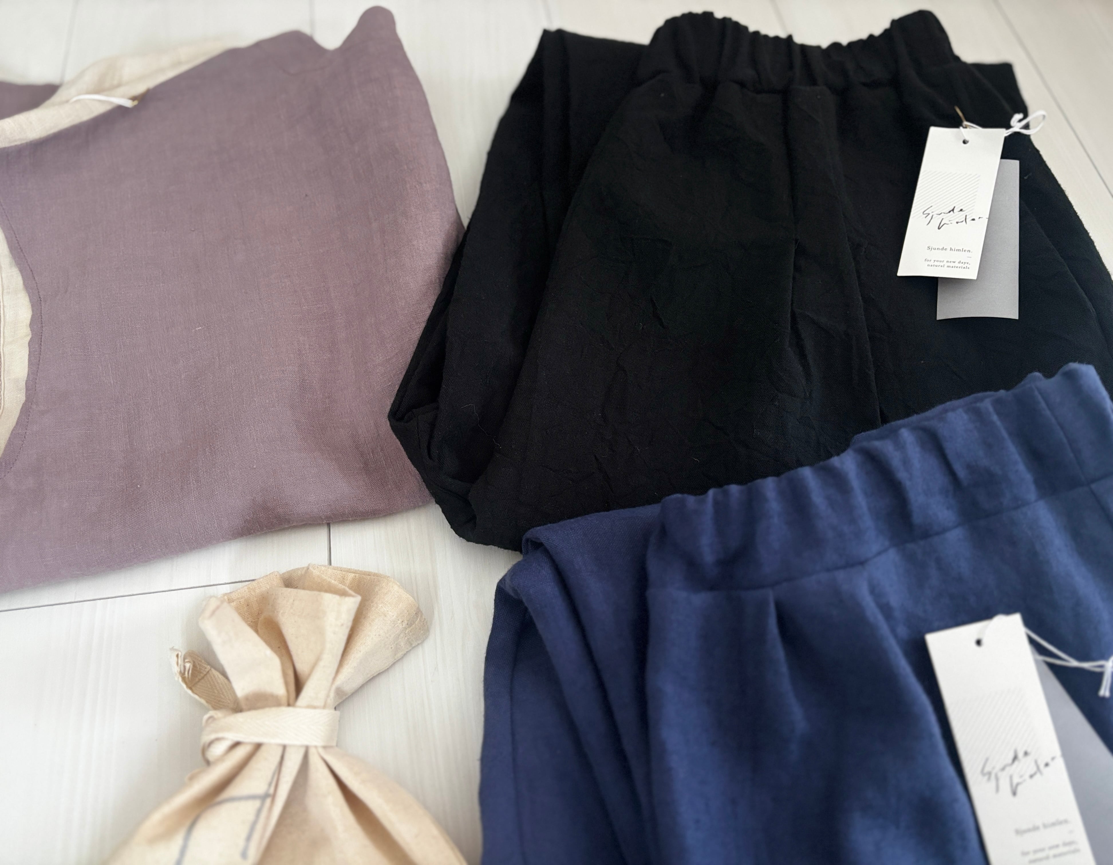 上質なリネンのセットアップ。薄手で重ね着にも、夏には一枚で楽しめるリネンのトップスのセット。コットンリネンのワイドボトムスもついてコーディネートが様々に楽しめる一品です。ミニ巾着は限定プリント入りです。