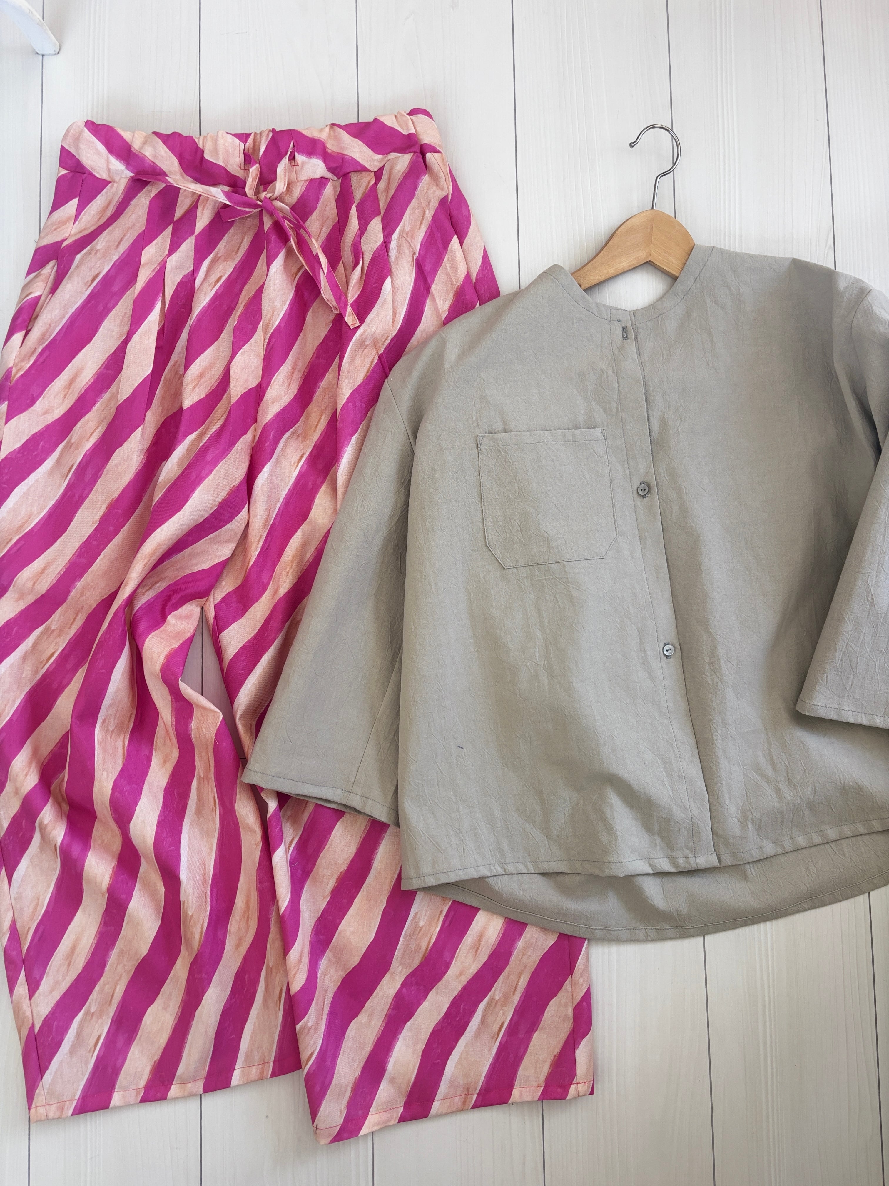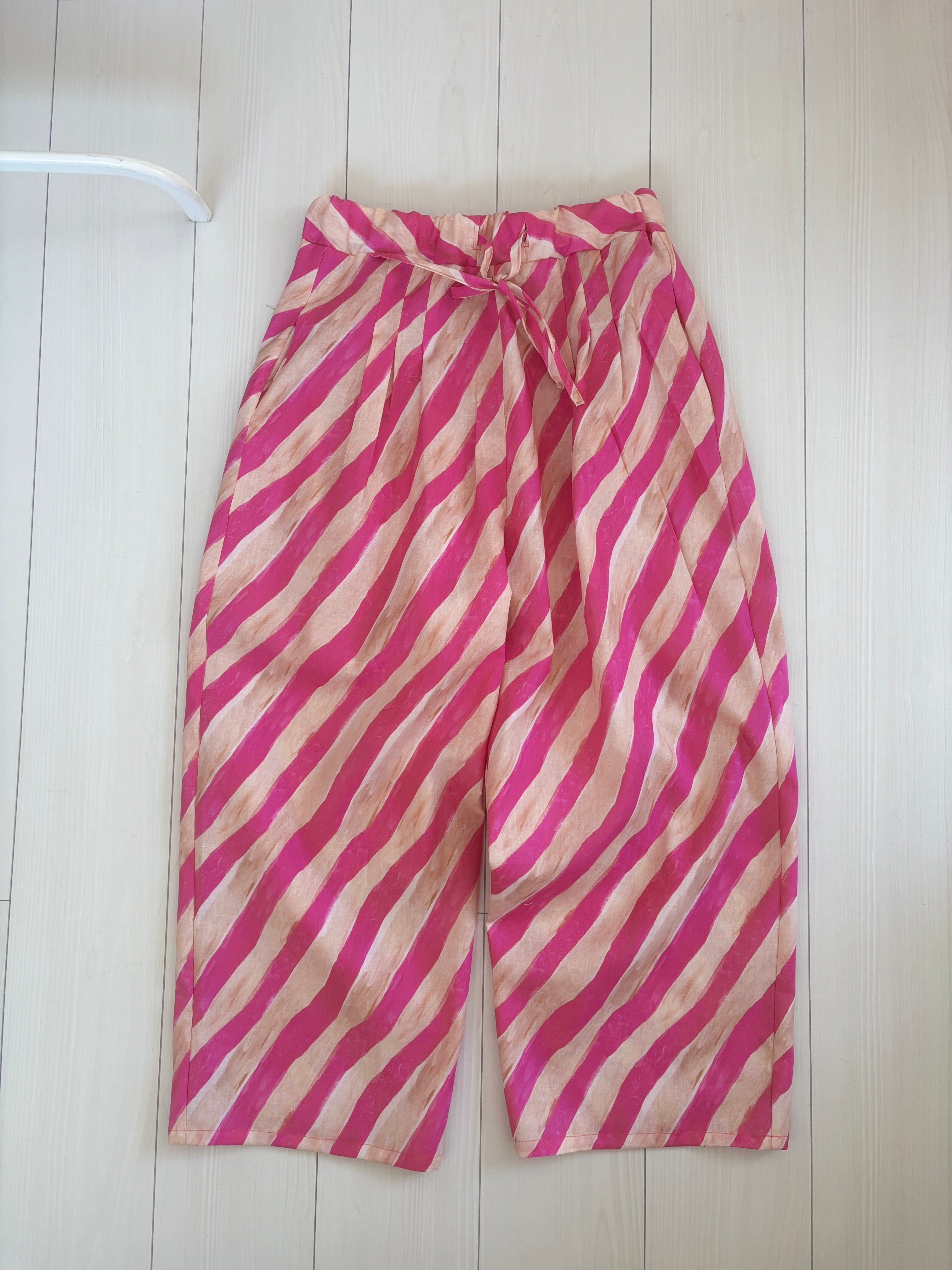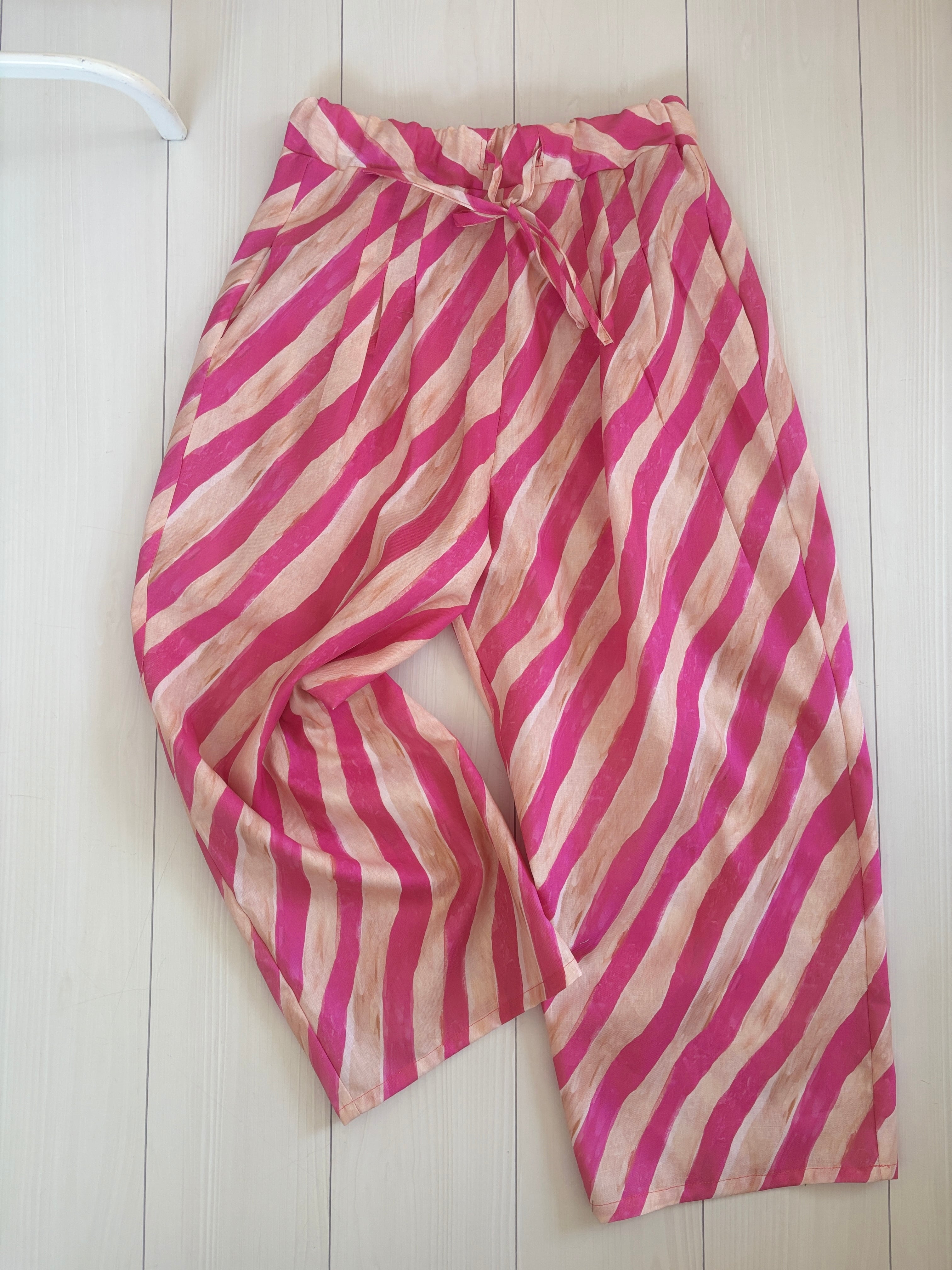 ヒムレンでは珍しく登場!今回の色テーマpinkでかわいい柄生地をボトムスにしました。リラックスして着られる、かつ、少し張りのある素材なのでパリッと可愛く着こなせます。
