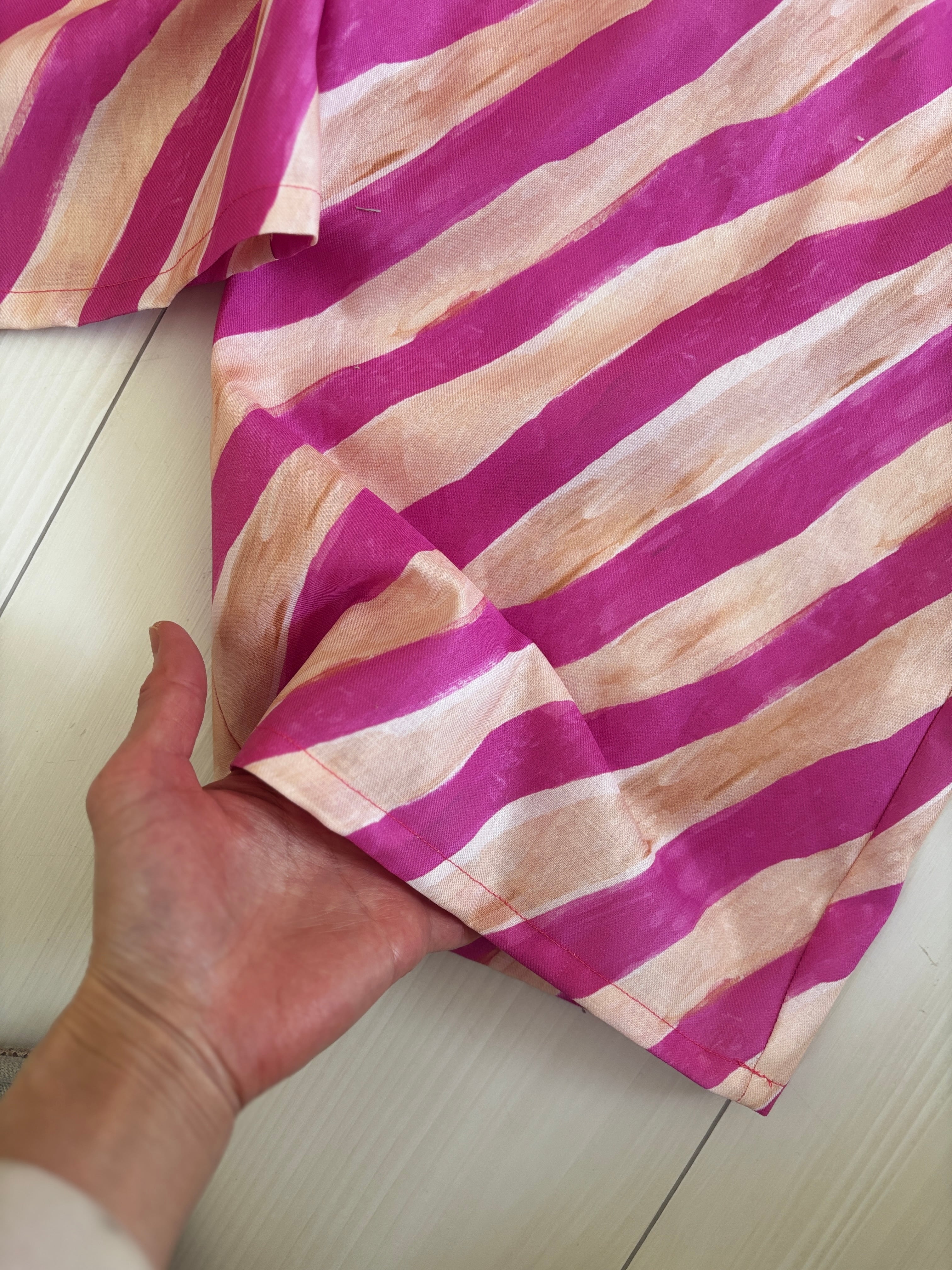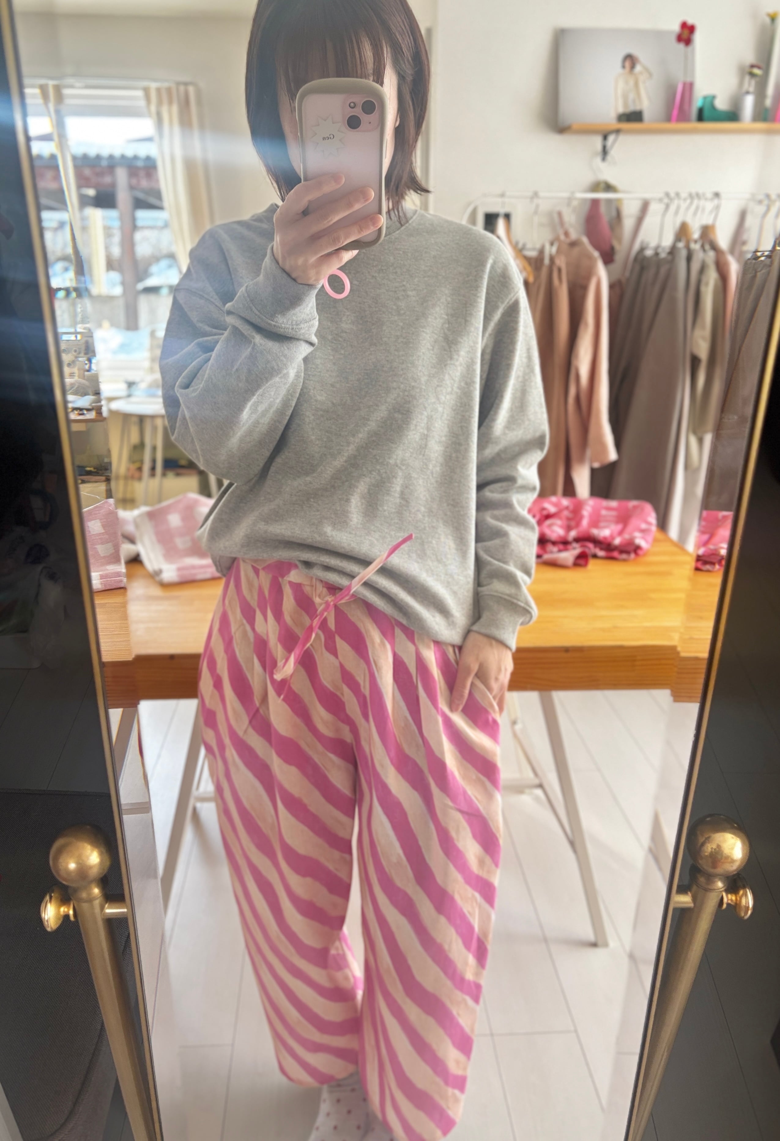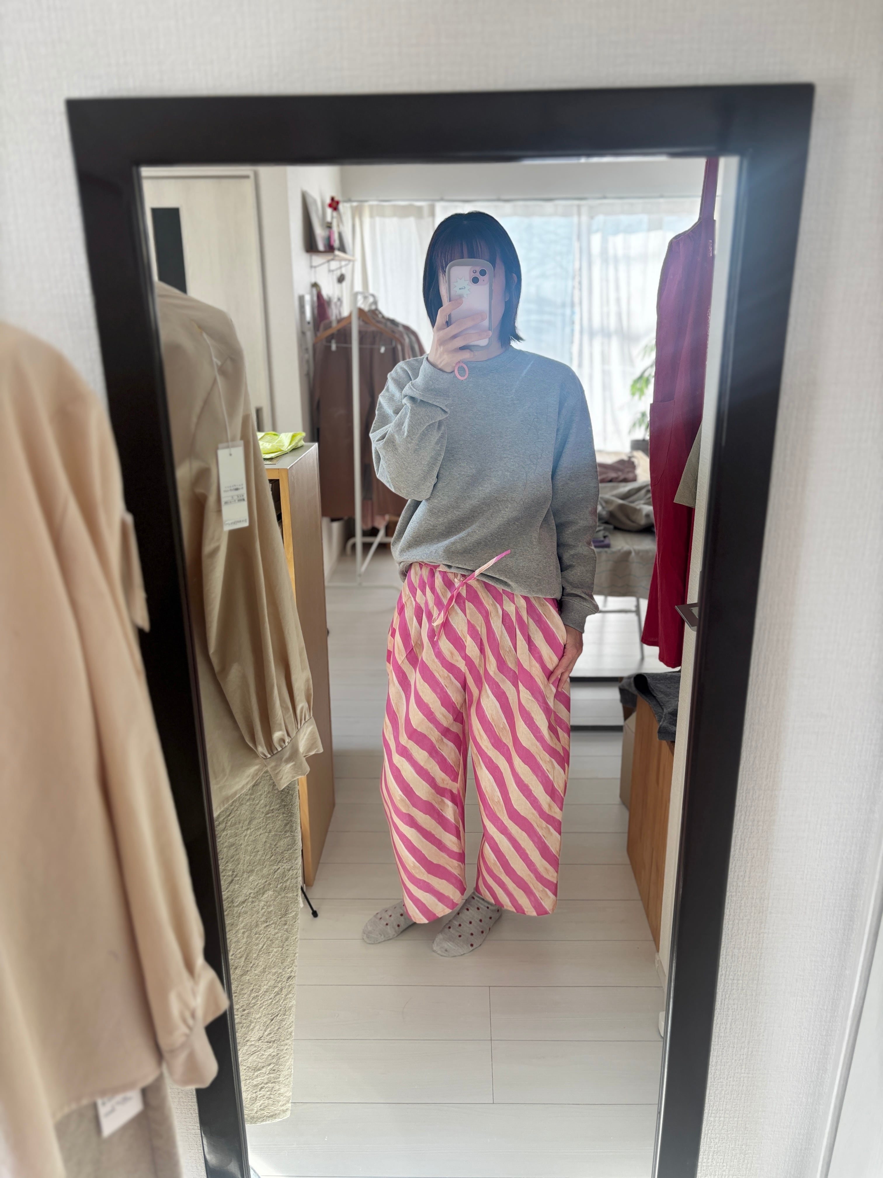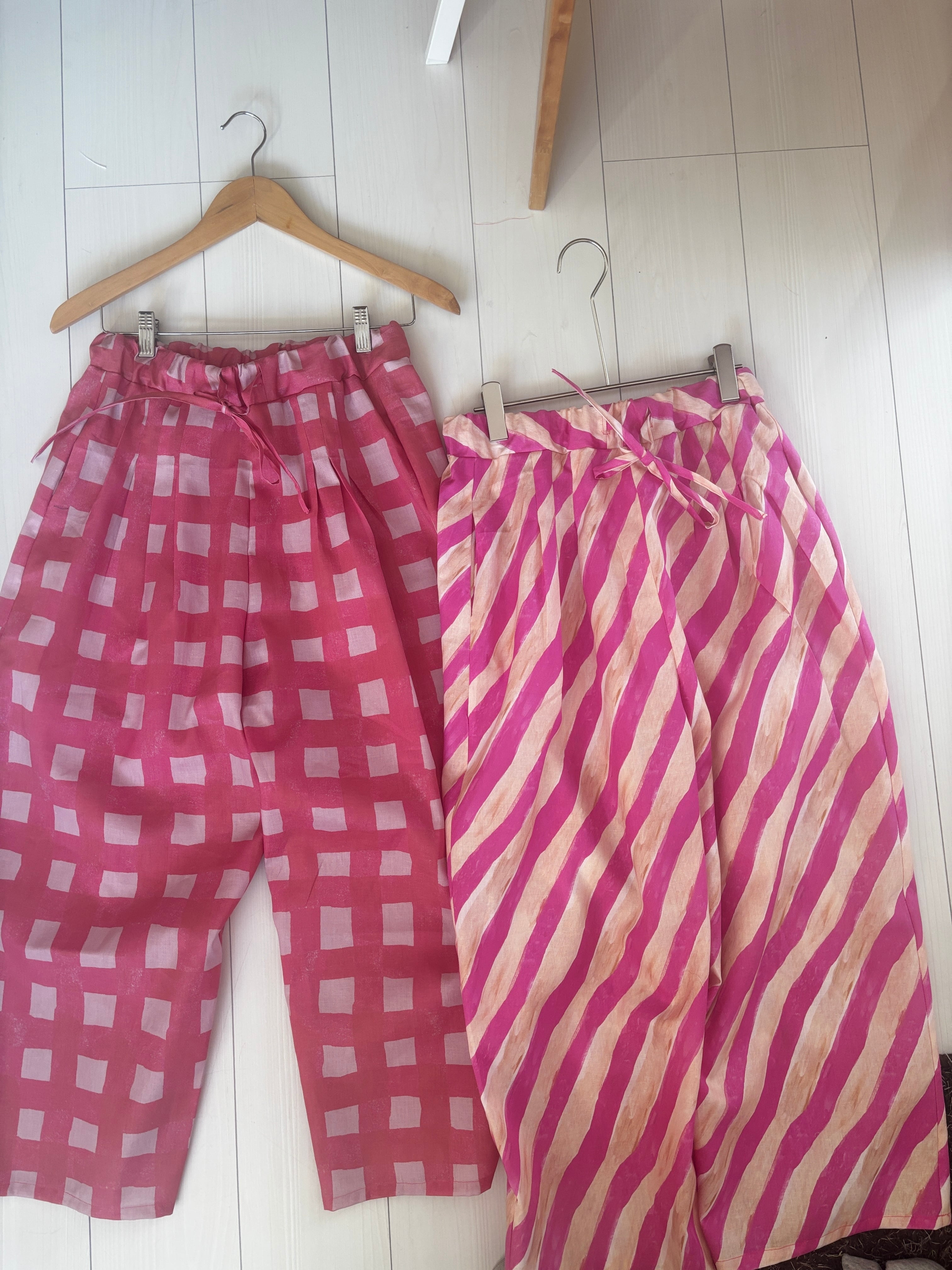 ヒムレンでは珍しく登場!今回の色テーマpinkでかわいい柄生地をボトムスにしました。リラックスして着られる、かつ、少し張りのある素材なのでパリッと可愛く着こなせます。