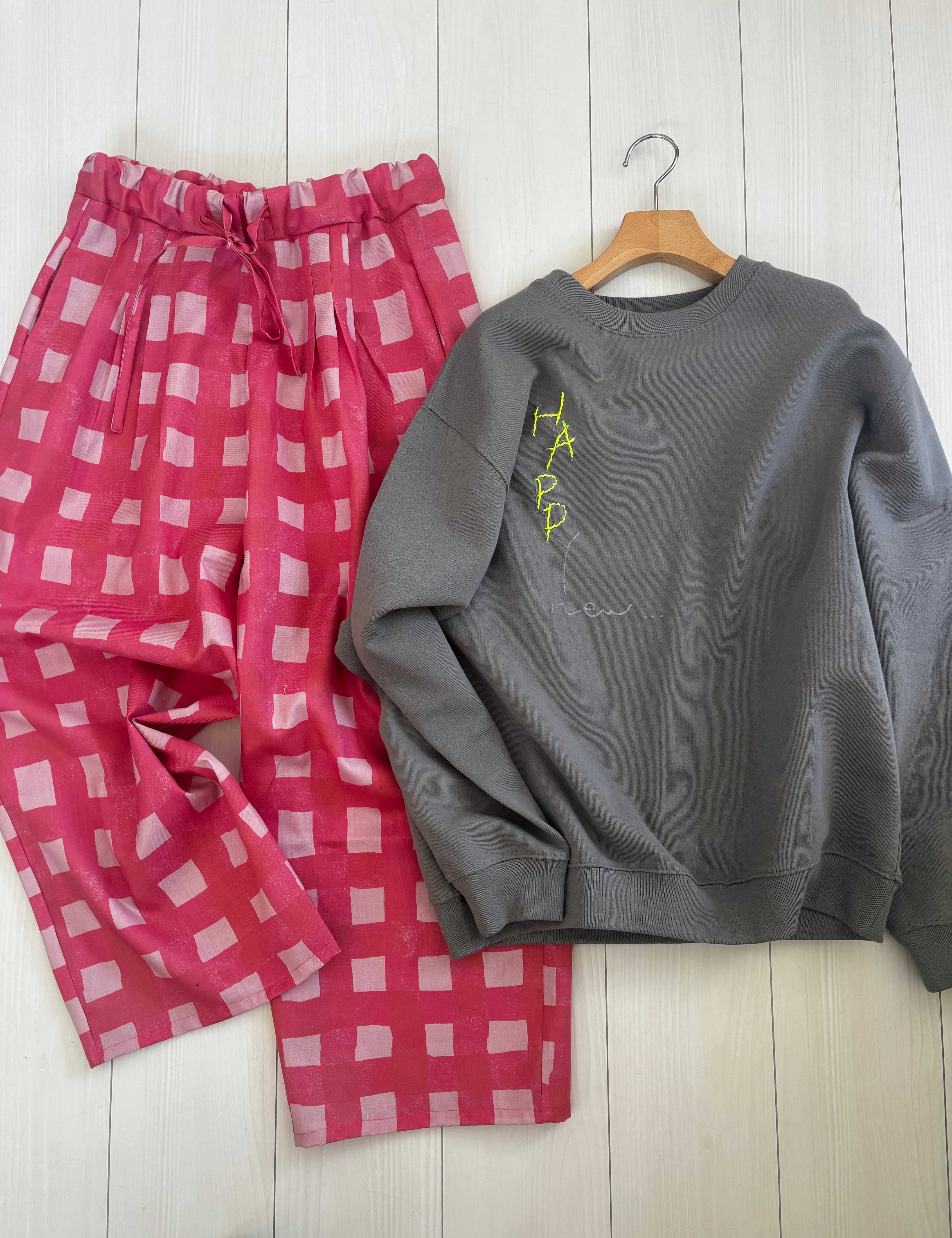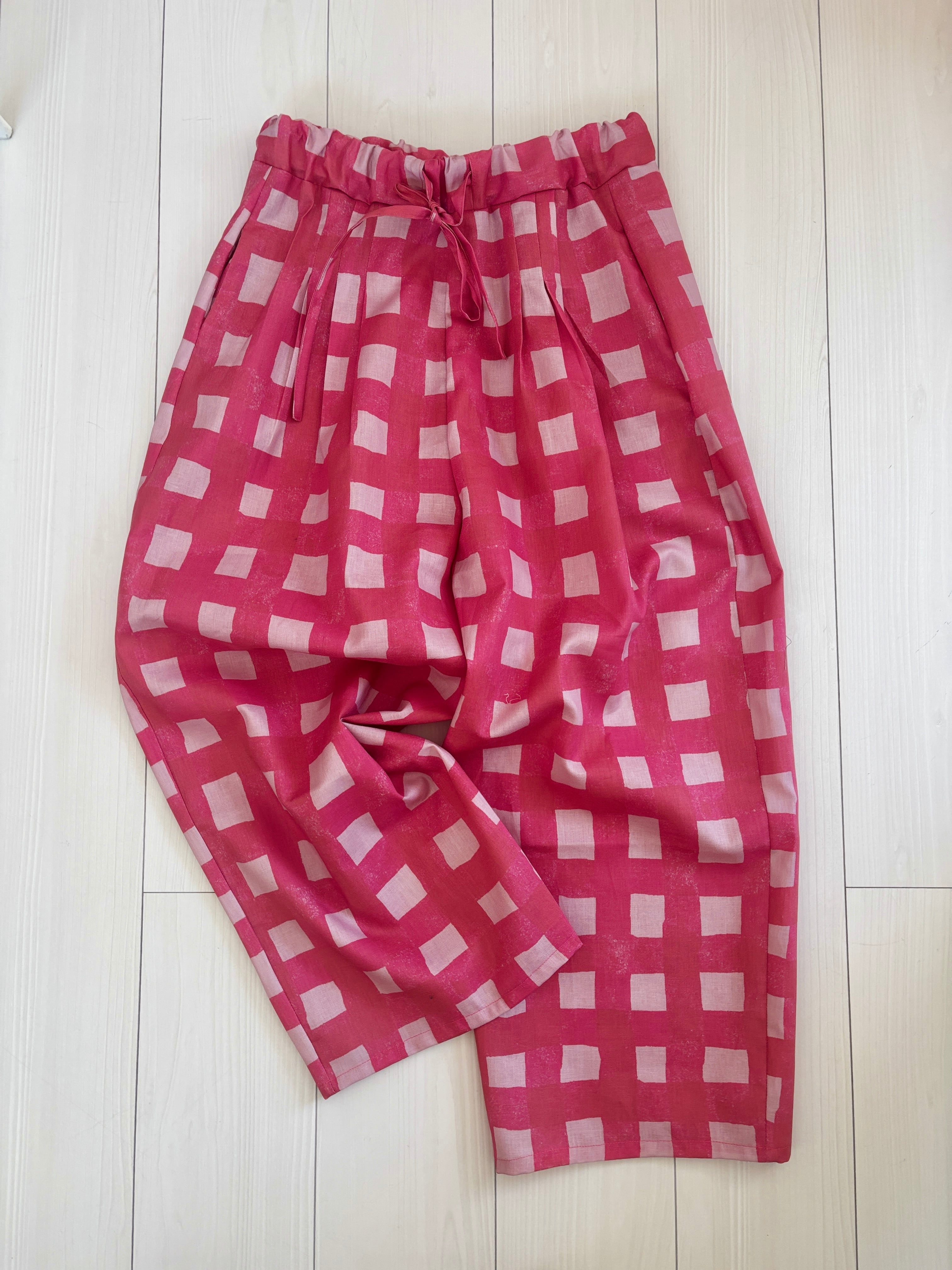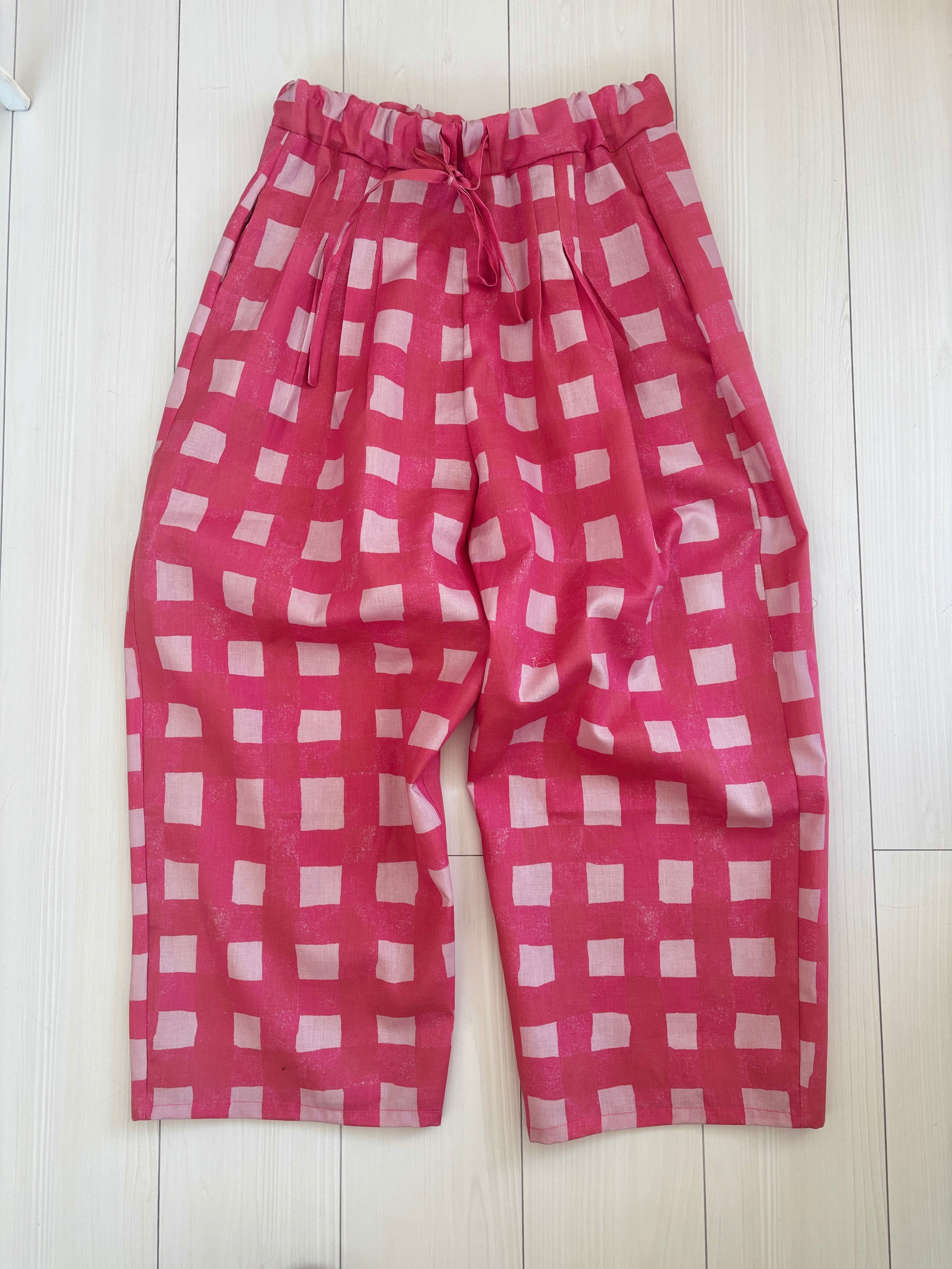 ヒムレンでは珍しく登場!今回の色テーマpinkでかわいい柄生地をボトムスにしました。リラックスして着られる、かつ、少し張りのある素材なのでパリッと可愛く着こなせます。