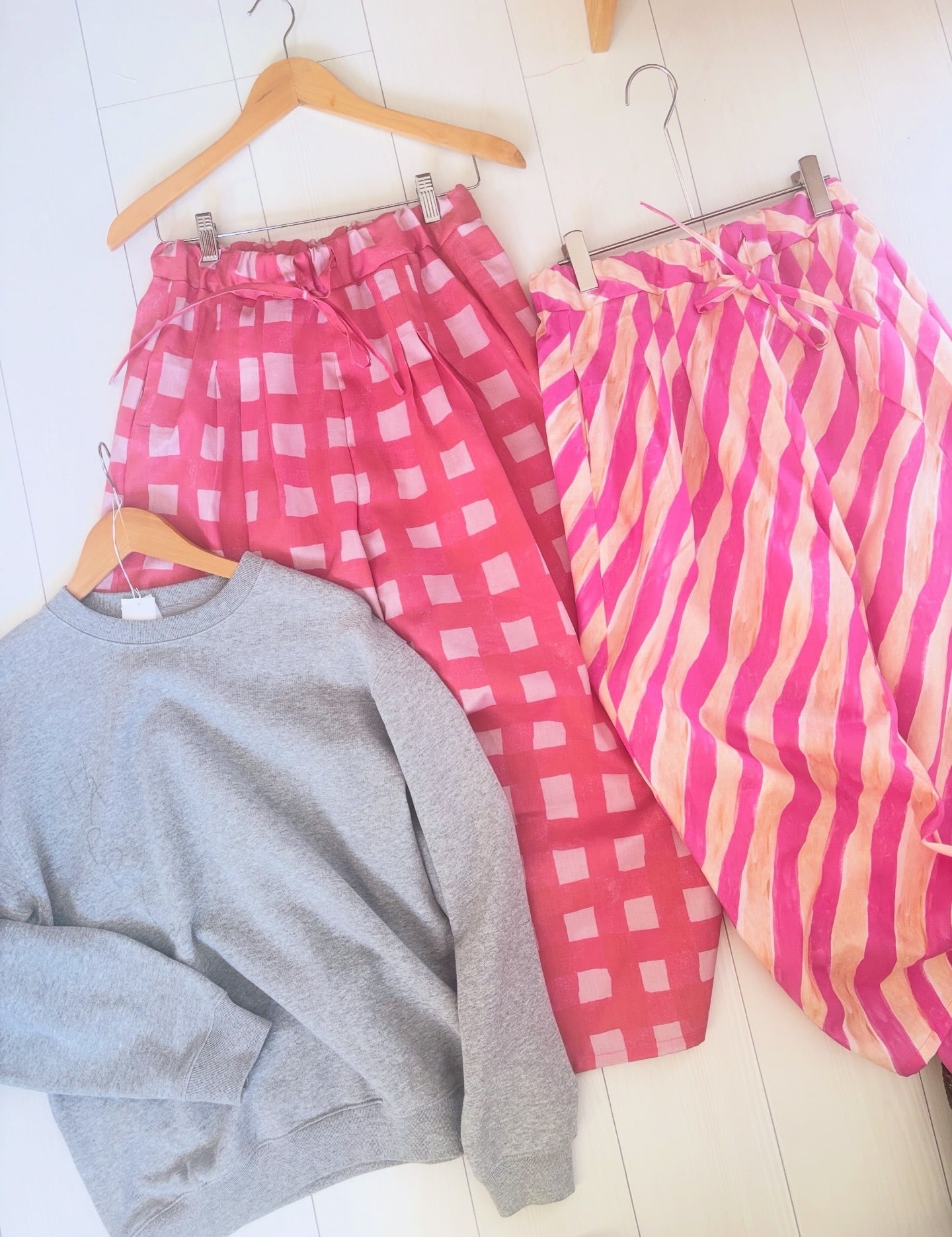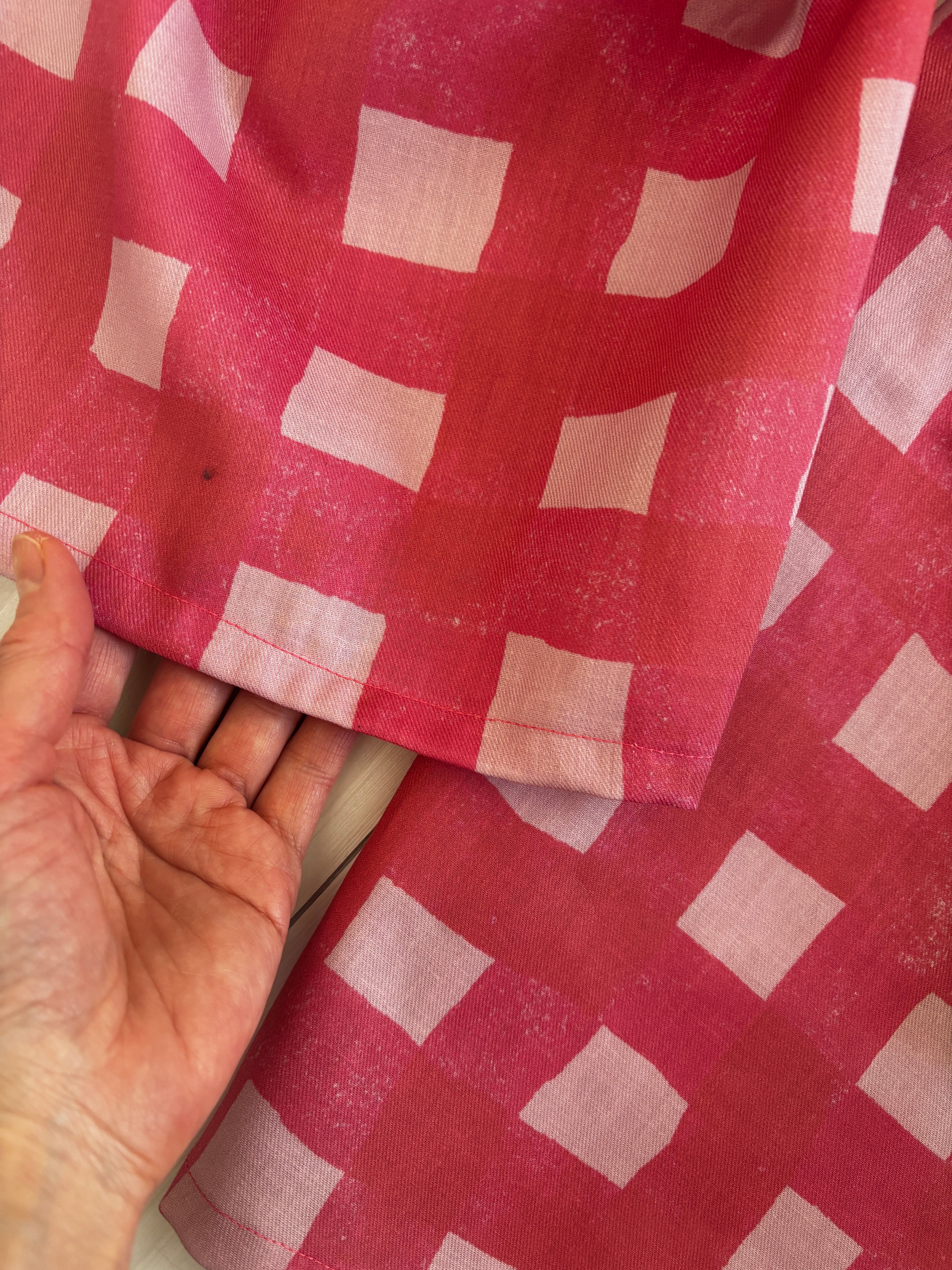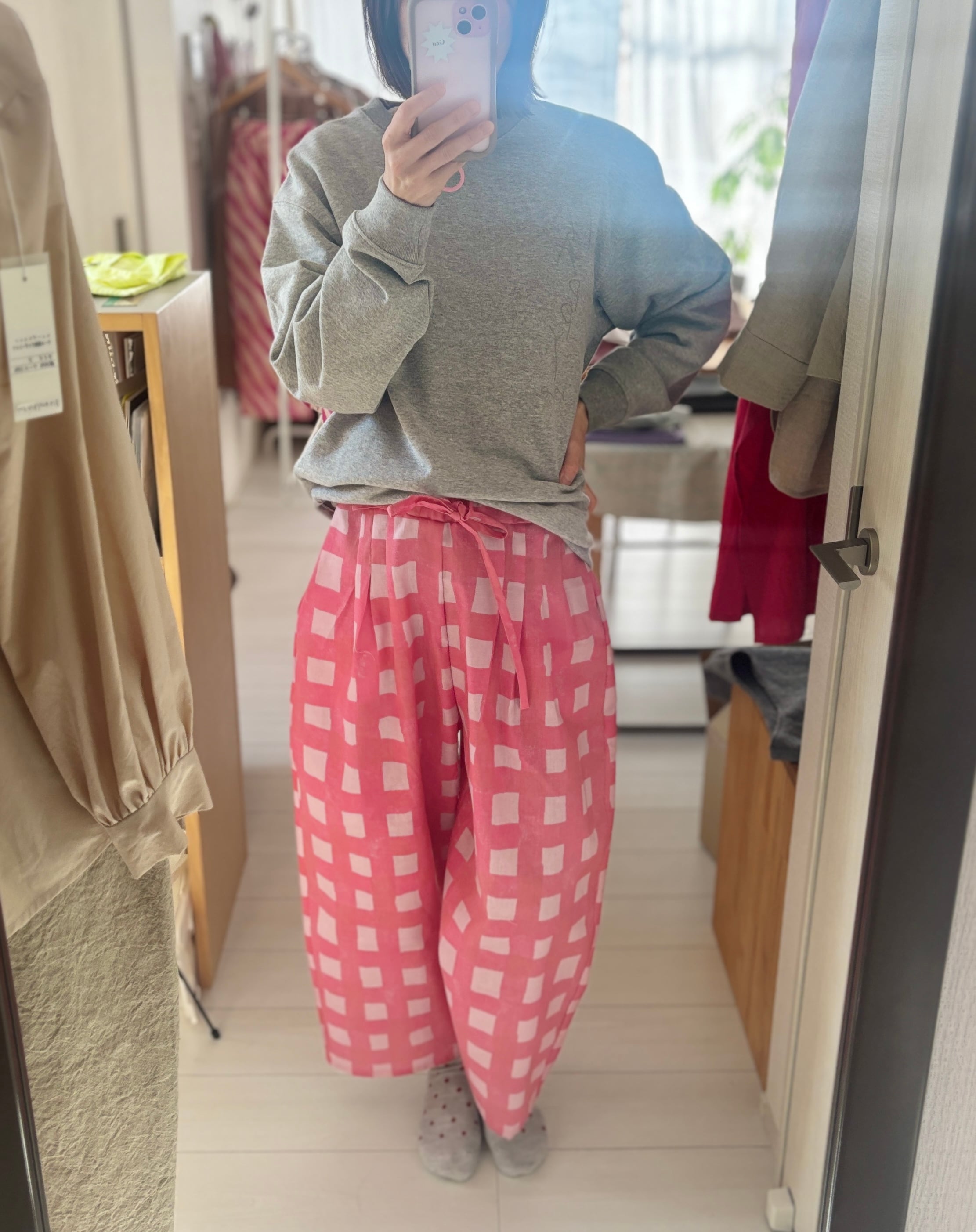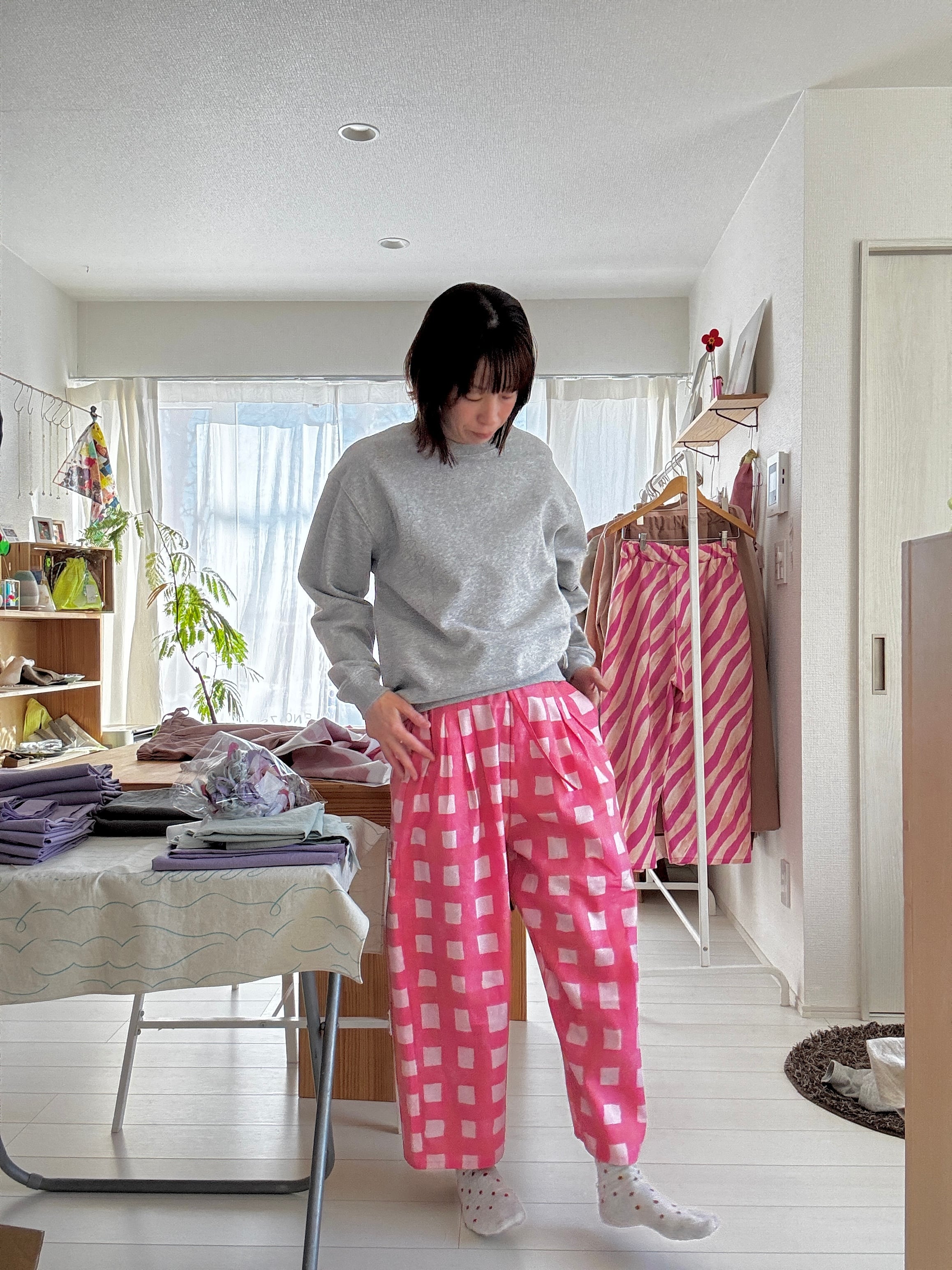 ヒムレンでは珍しく登場!今回の色テーマpinkでかわいい柄生地をボトムスにしました。リラックスして着られる、かつ、少し張りのある素材なのでパリッと可愛く着こなせます。