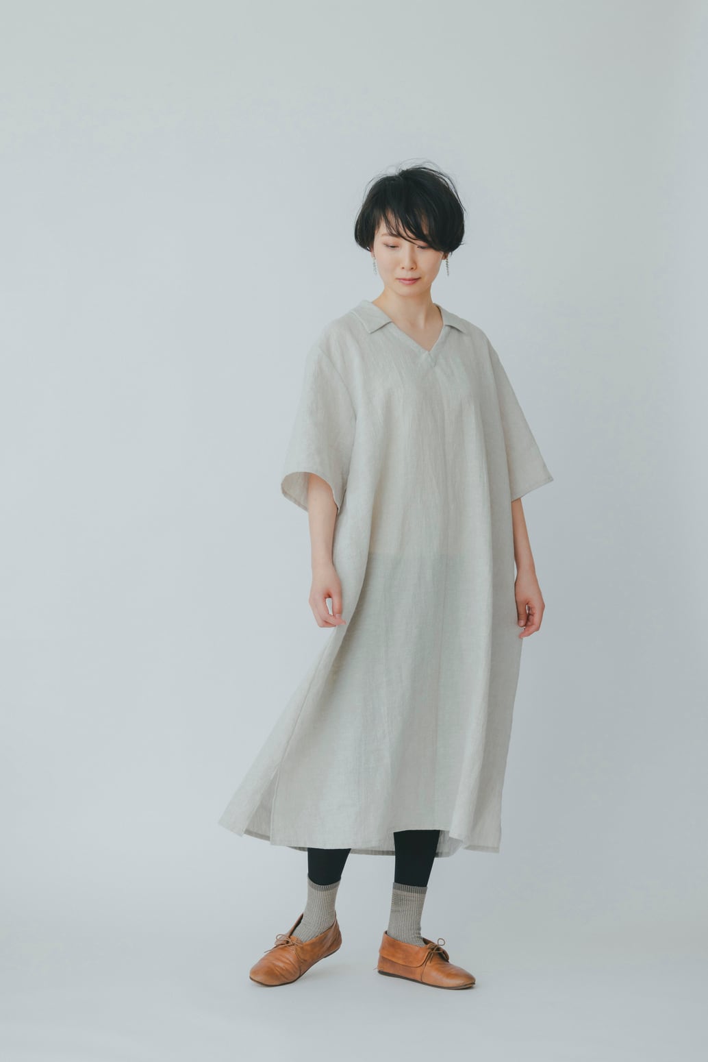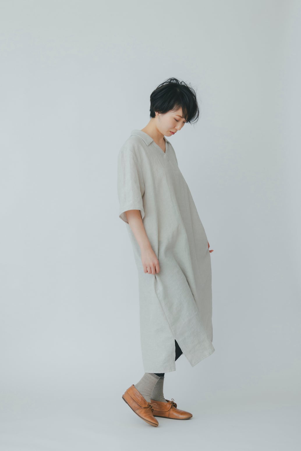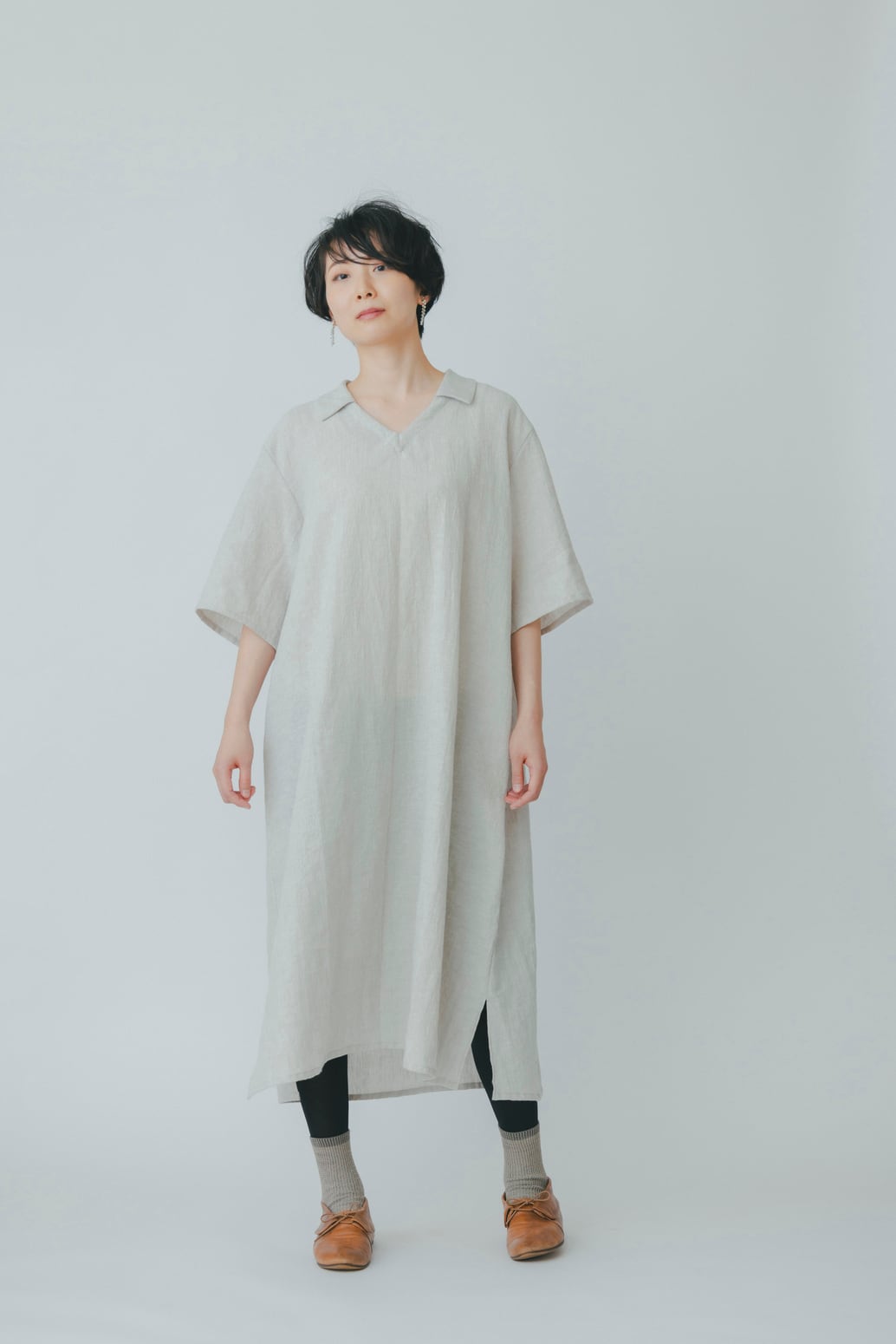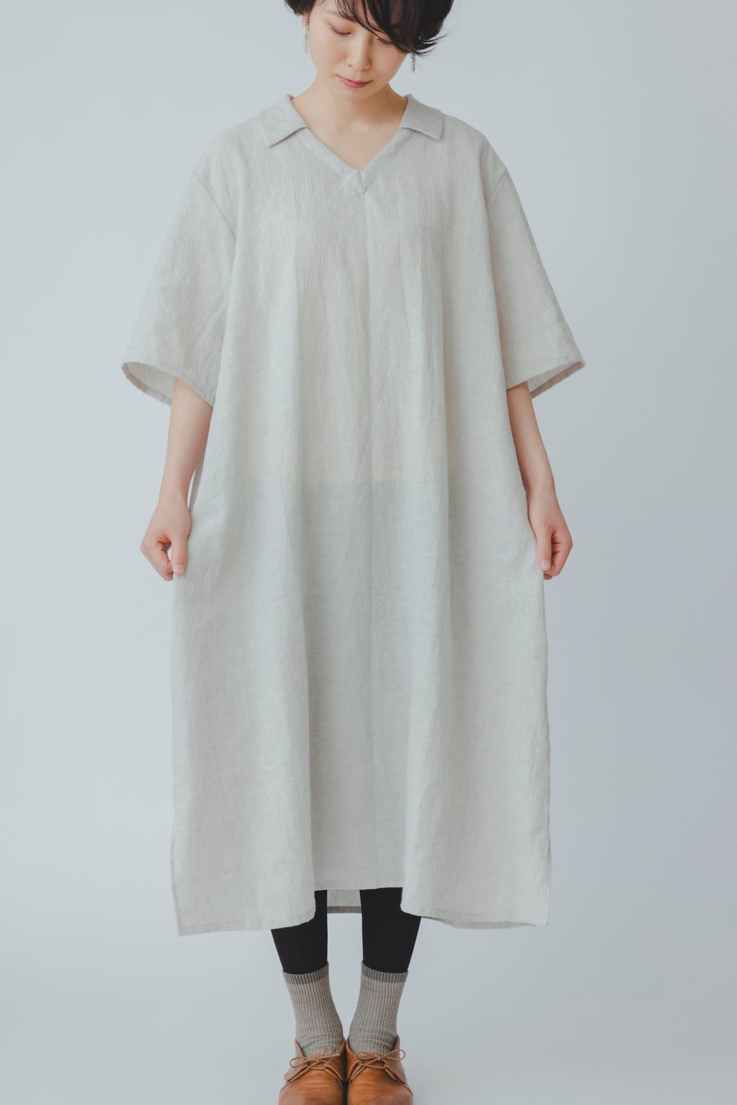 1枚でサラリと着れて重宝するロングワンピースです。程よく薄手のコットンリネンでさらりと軽く、また程よく身幅もつけているので中に重ね着するにも着やすいです。
