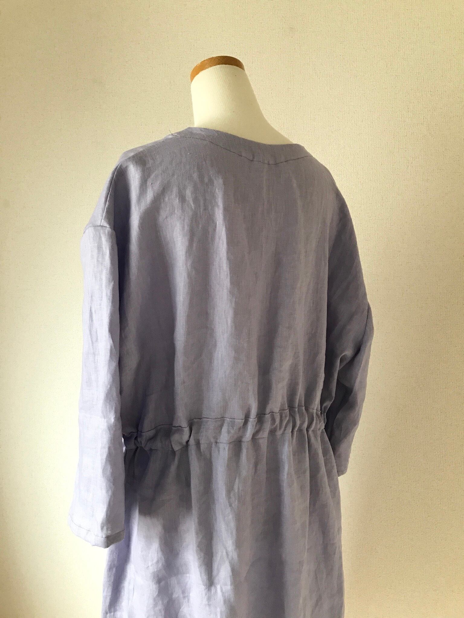 リネン生地で張りがありつつもシワ感がかわいい風合いです。ウエストに紐を通してるのでフロントでリボン縛りをしてギャザーを楽しめたりとさまざまな形で楽しめます。