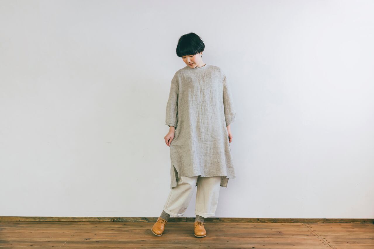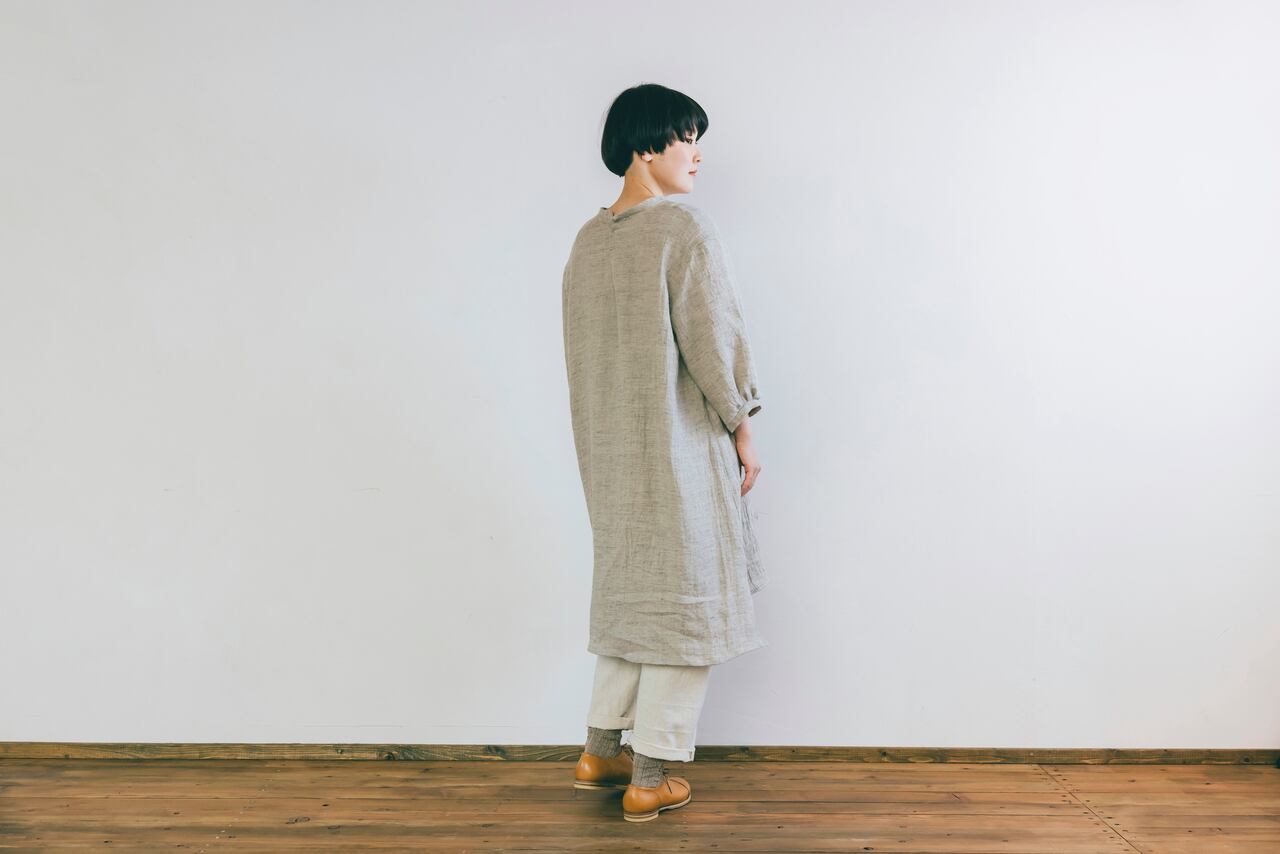 上質なリネン素材がしっとりと上品な雰囲気を演出してくれるワンピースです。シンプルながらもスタンドカラーと脇スリットがポイント。