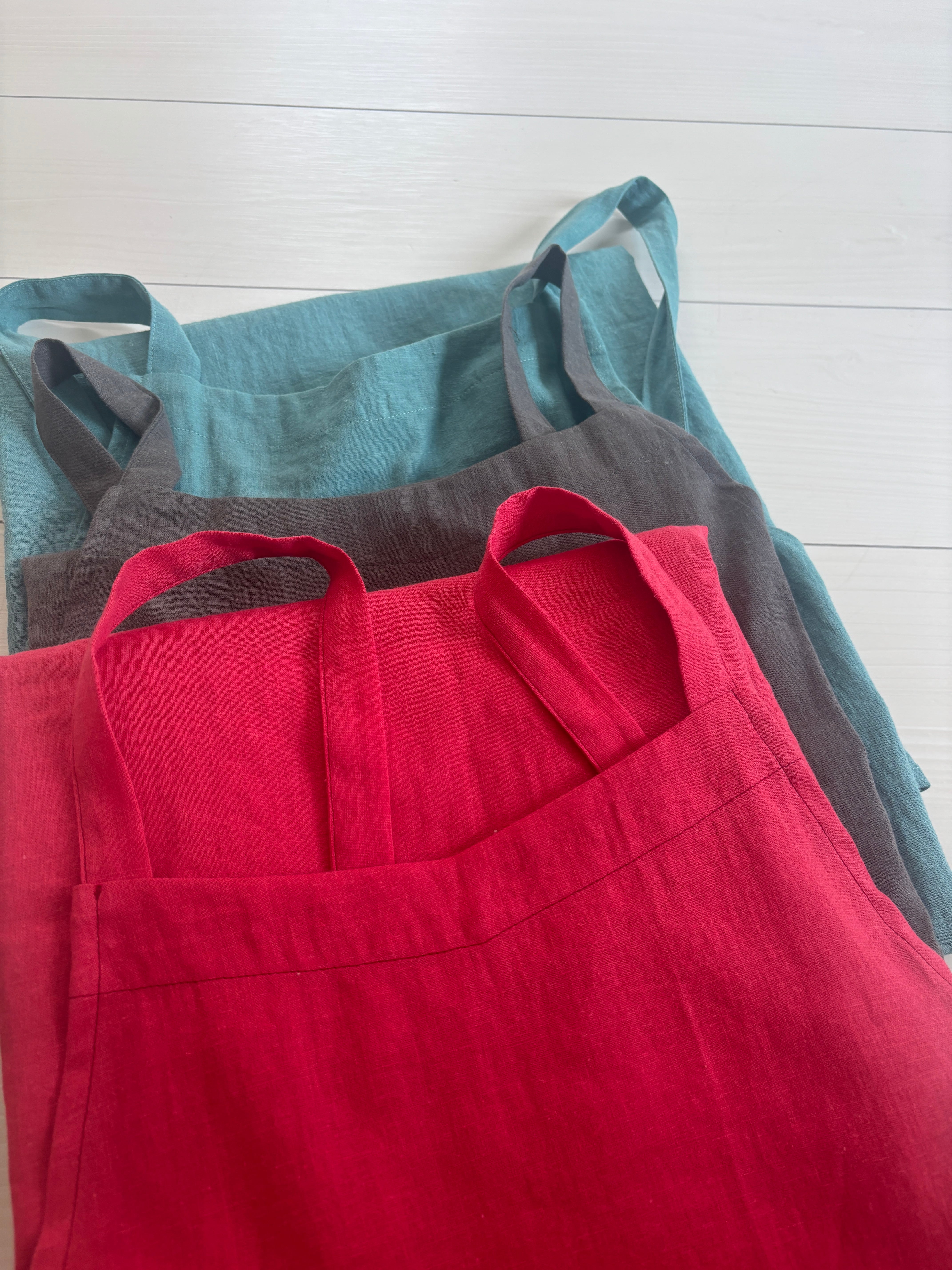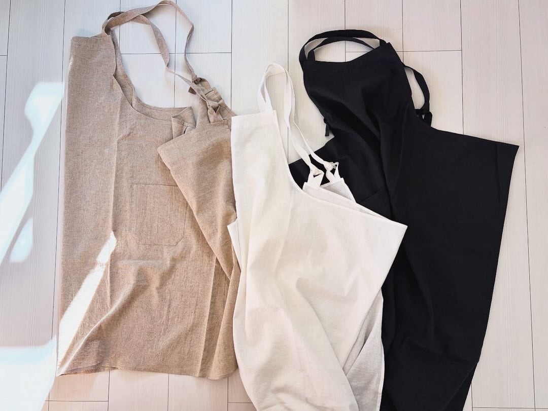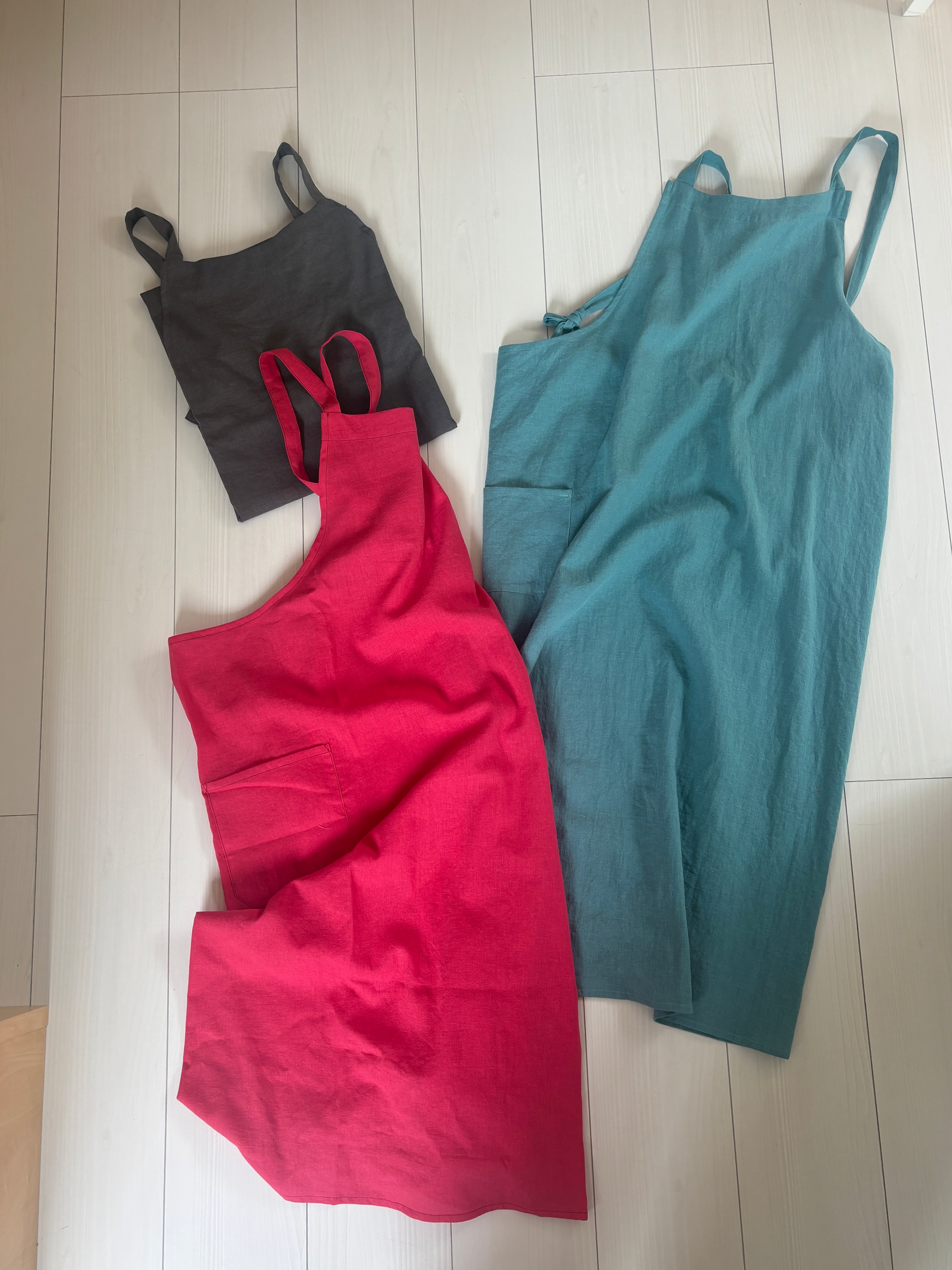 【オーダー制作】軽くてかわいい!人気のコットンリネンのエプロンタイプのワンピース。 後ろも見頃が重なりすっぽりと着れるタイプの形なので今着ているお洋服の上からも楽しめる一枚。エプロンとしての活用もよいですがワンピースとして楽しんでいただける万能なアイテムです。